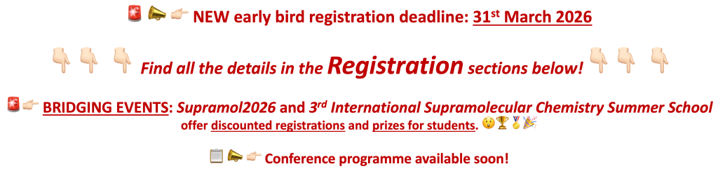 Five discounted registration slots are available for PhD students and postdocs who register for both the 3rd International Supramolecular Chemistry Summer School (Santa Margherita di Pula, Sardinia, May 24–29, 2026) AND Supramol2026. The total registration fee for both events is €650 instead of €950.